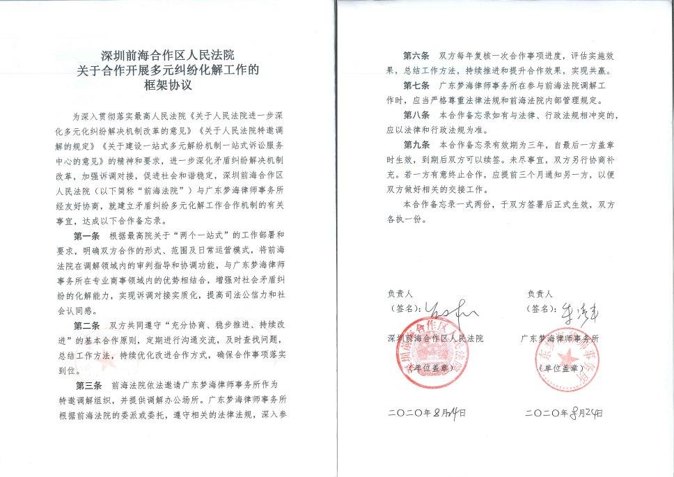 近日,深圳前海合作区人民法院(以下简称“前海法院”)与广东梦海律师事务所经友好协商,就建立矛盾纠纷多元化解工作合作机制的有关事宜,正式签署合作协议。