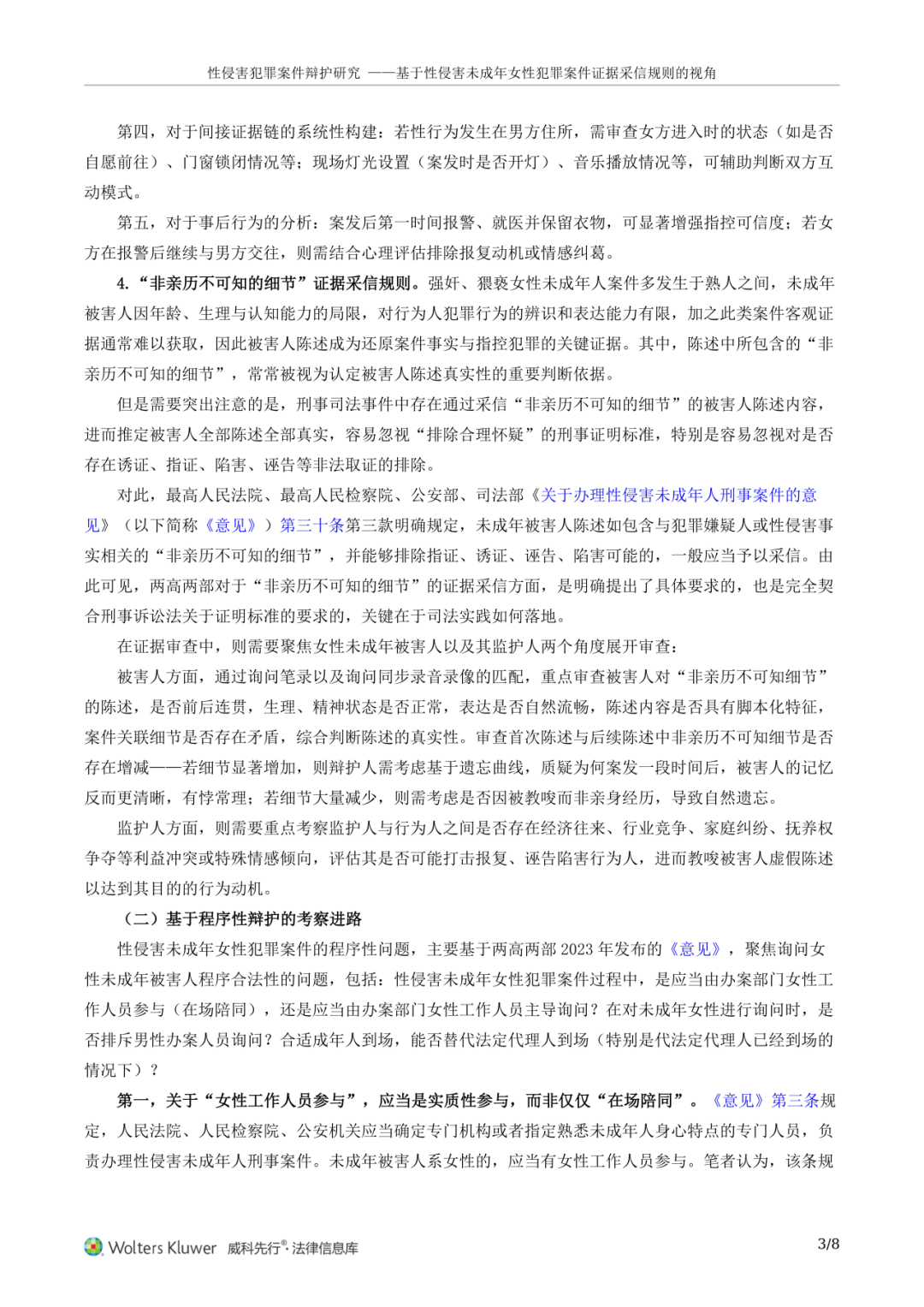 针对未成年女性被害人身心特点,文章论述了从“性自主决定权”延伸到“身心健康发展权”的保护法益,“违背被害人意志”的具体内涵,“临时违背意愿”的证据审查,以及“非亲历不可知细节”的证据采信规则等。同时,文章强调了办案机关女性工作人员在询问未成年女性被害人程序中的“实质参与”,以及法定代理人、合适成年人“实质到场”的重要性。