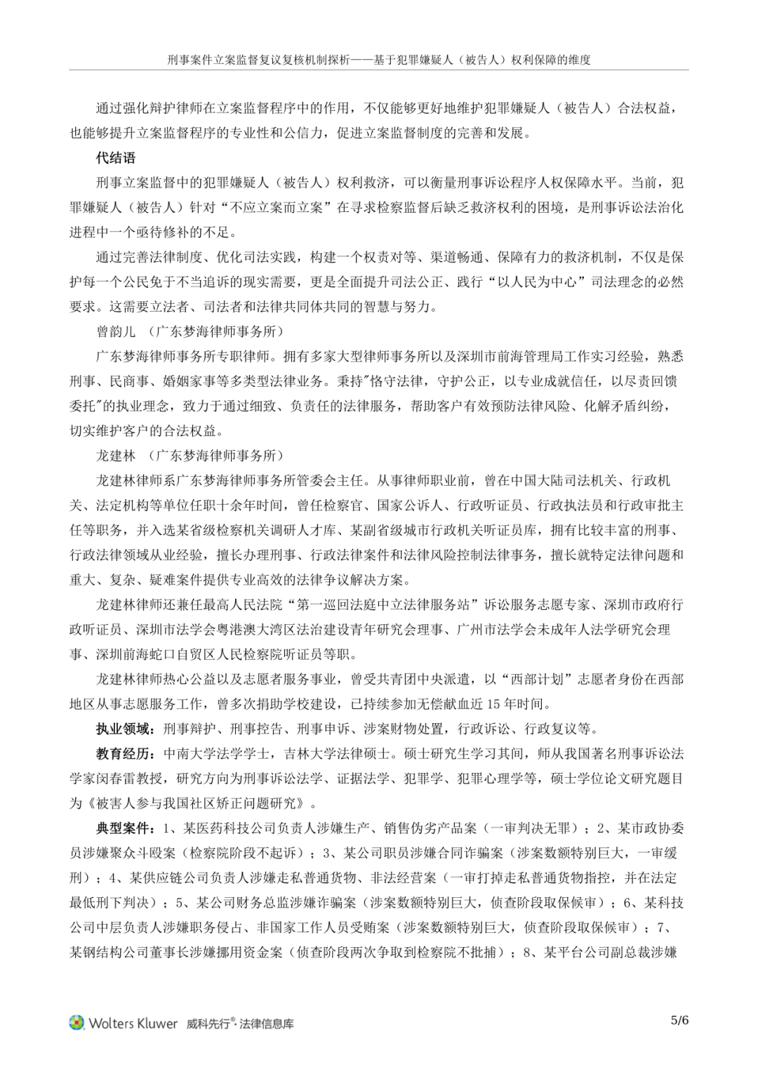 近日,威科先行法律信息库全文刊载广东梦海律师事务所曾韵儿律师、广东梦海律师事务所管委会主任龙建林律师原创研究文章——《刑事案件立案监督复议复核机制探析——基于犯罪嫌疑人(被告人)权利保障的维度》。