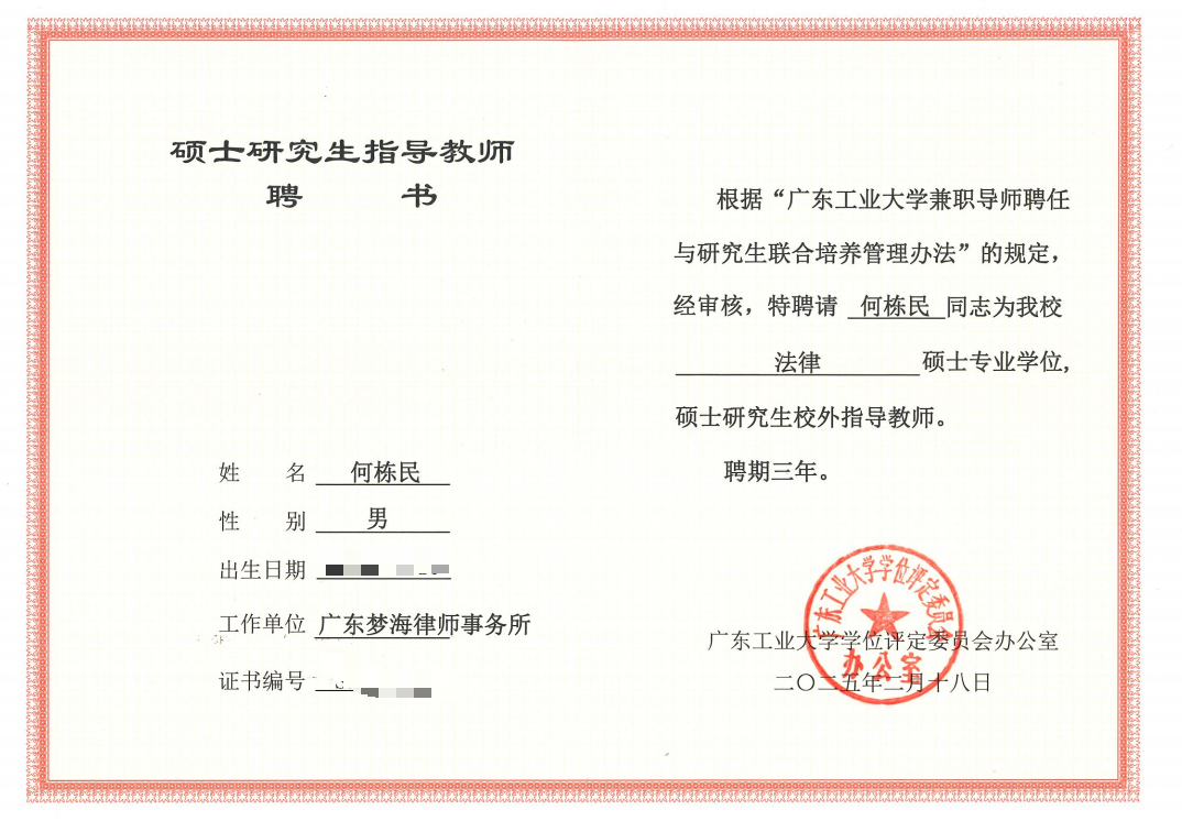 近期,广东梦海律师事务所创始人、董事局主席何栋民律师凭借其卓越的专业素养和丰富的实践经验,获聘为广东工业大学法学院硕士研究生校外导师。