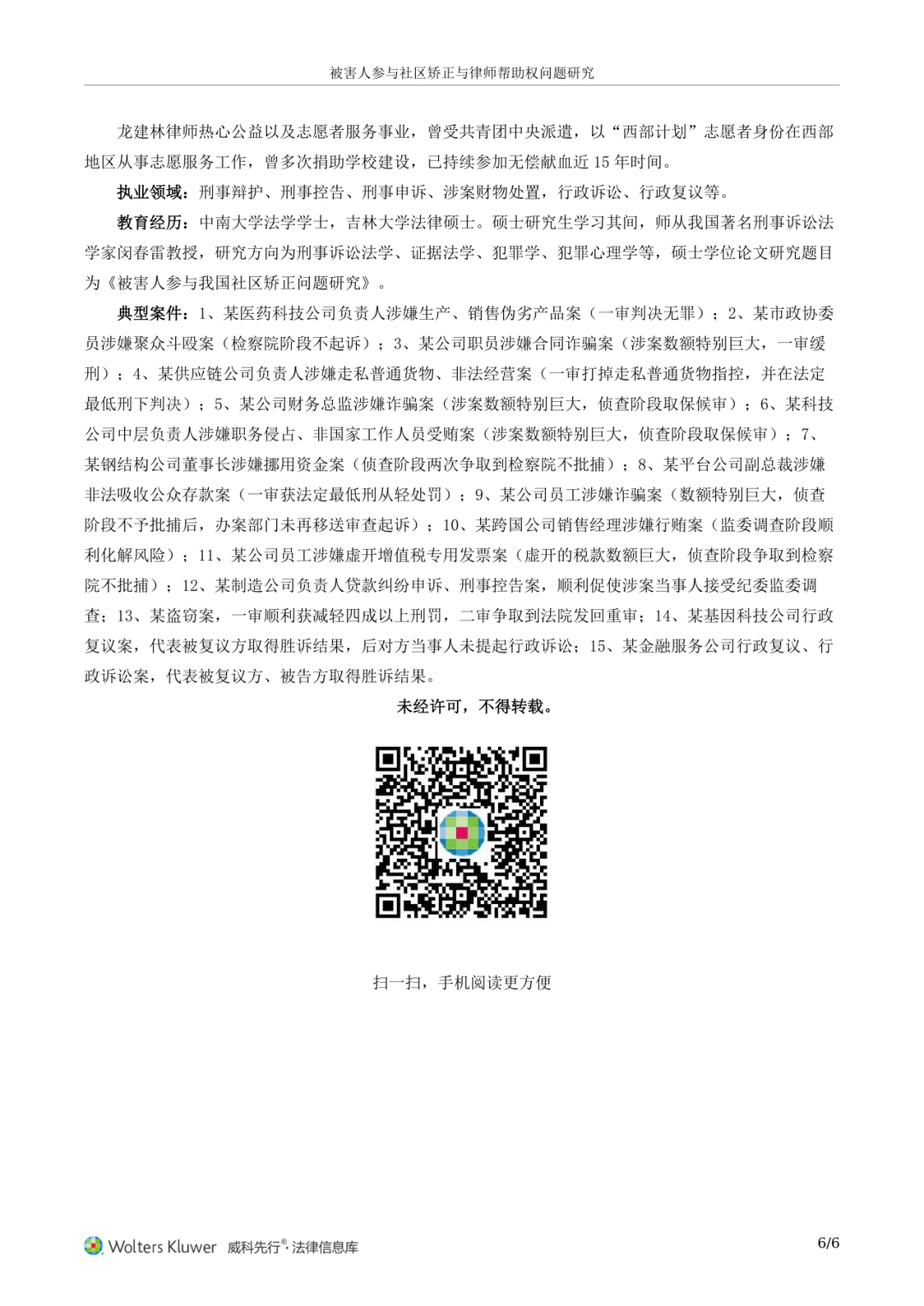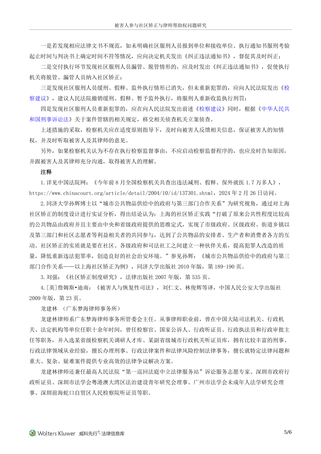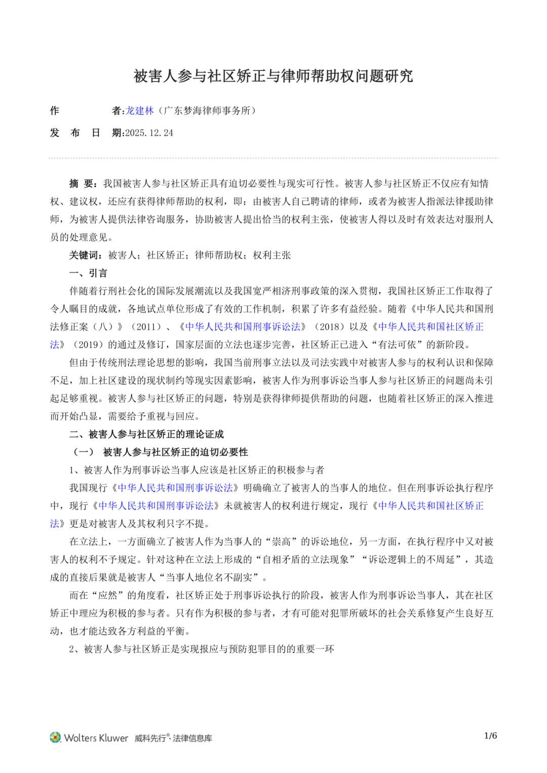 近日,威科先行法律信息库全文刊载广东梦海律师事务所管委会主任龙建林律师原创研究文章——《被害人参与社区矫正与律师帮助权问题研究》。