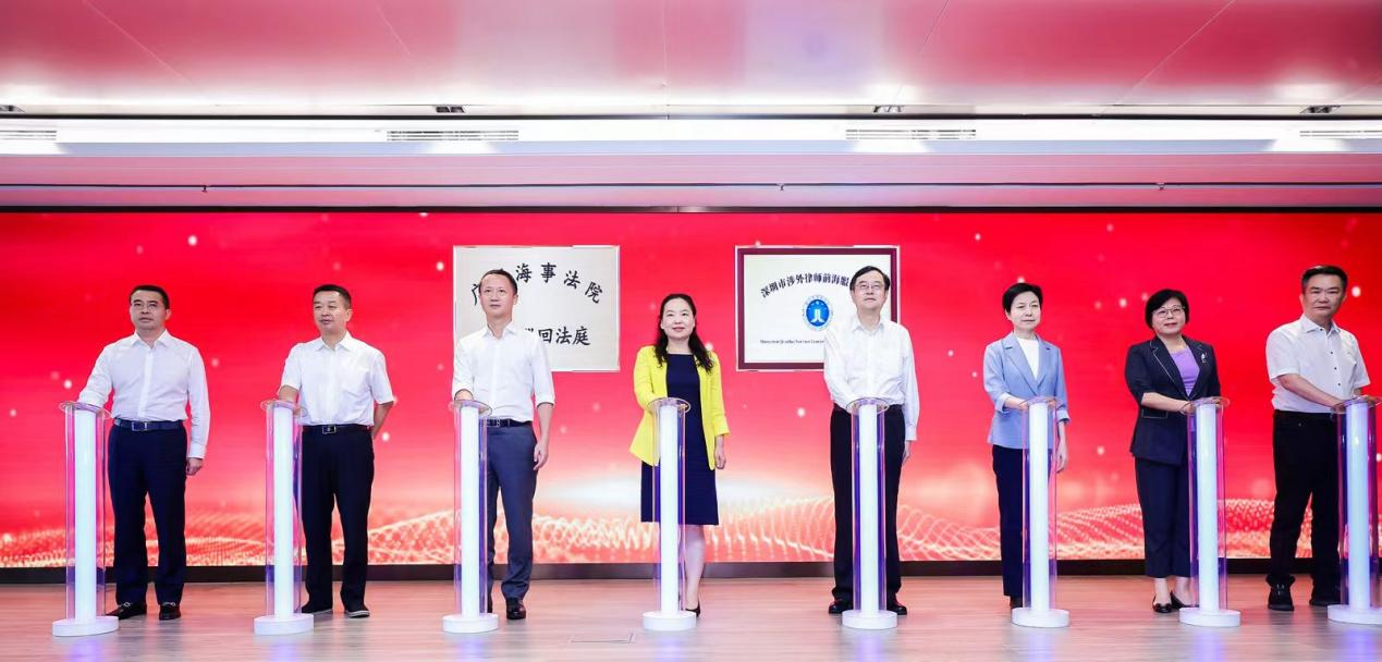 (自左至右分别为市前海管理局刘桂林副局长、市检察院李小东检察长、深圳市余钢常委、广东省委常委、政法委书记袁古洁、省司法厅厅长陈旭东、市中院赵菊花院长、市司法局蒋小文局长、广州海事法院刘思彬副院长)