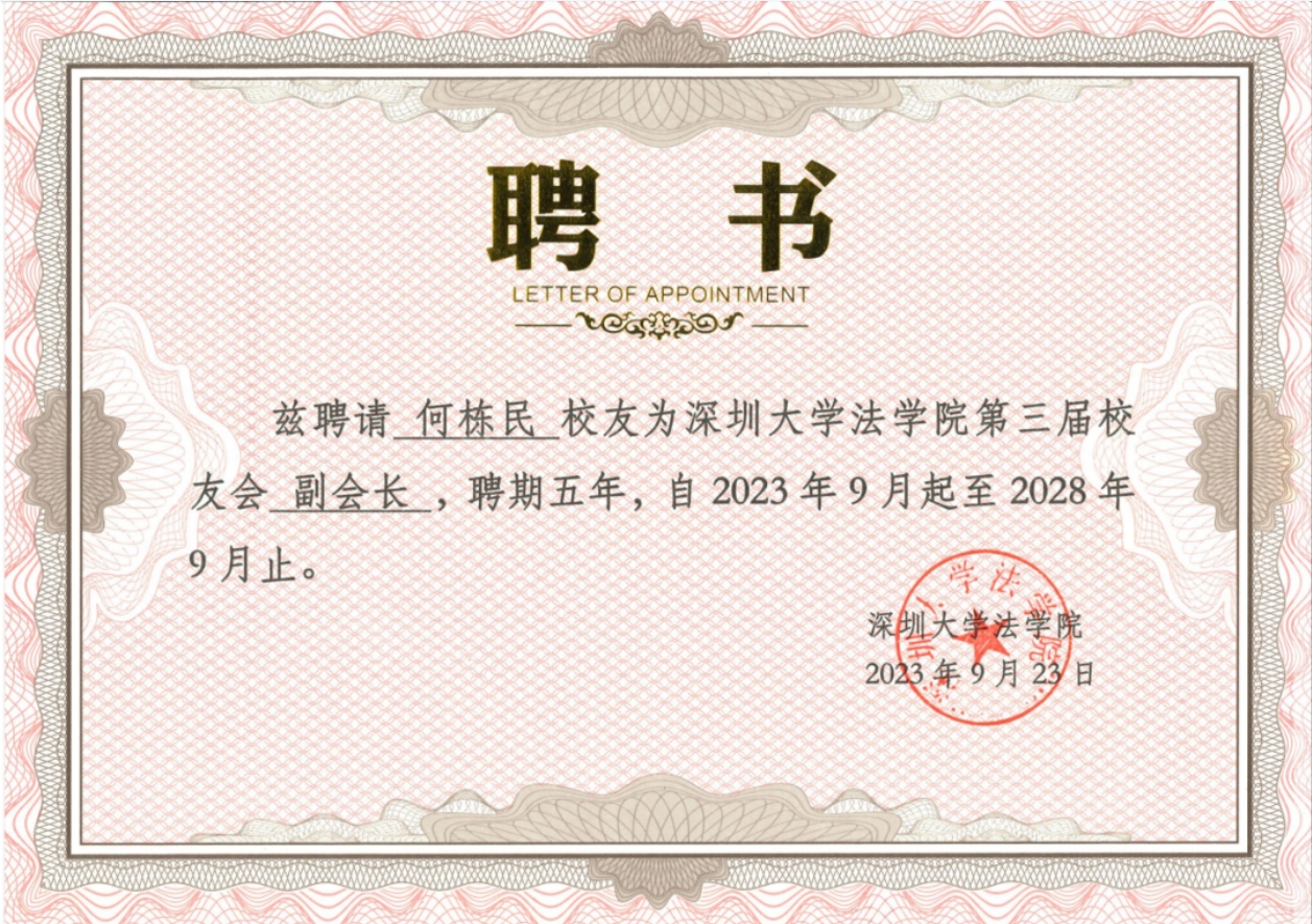 热烈祝贺梦海律所何栋民律师担任深圳大学法学院校友会副会长