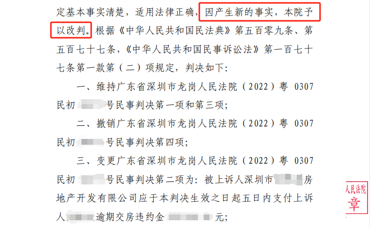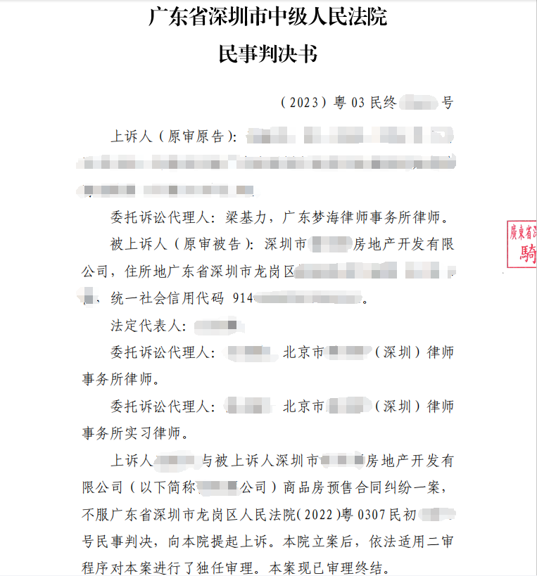 近日,龙岗区某小区购房者李先生,收到了深圳市中级人民法院做出二审判决书。该判决书撤销了一审法院作出判决,采纳了广东梦海律师事务所梁基力律师提出的上诉意见,改判某房地产开发商向李先生赔付逾期交房违约金。