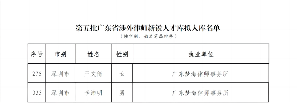 近日,广东省律师协会公布了第五批广东省涉外律师事务所库和涉外律师人才库名单。其中,广东梦海律师事务所成功入选第五批广东省涉外律师事务所库,王文倩律师、李沛明律师入选涉外律师新锐人才库。