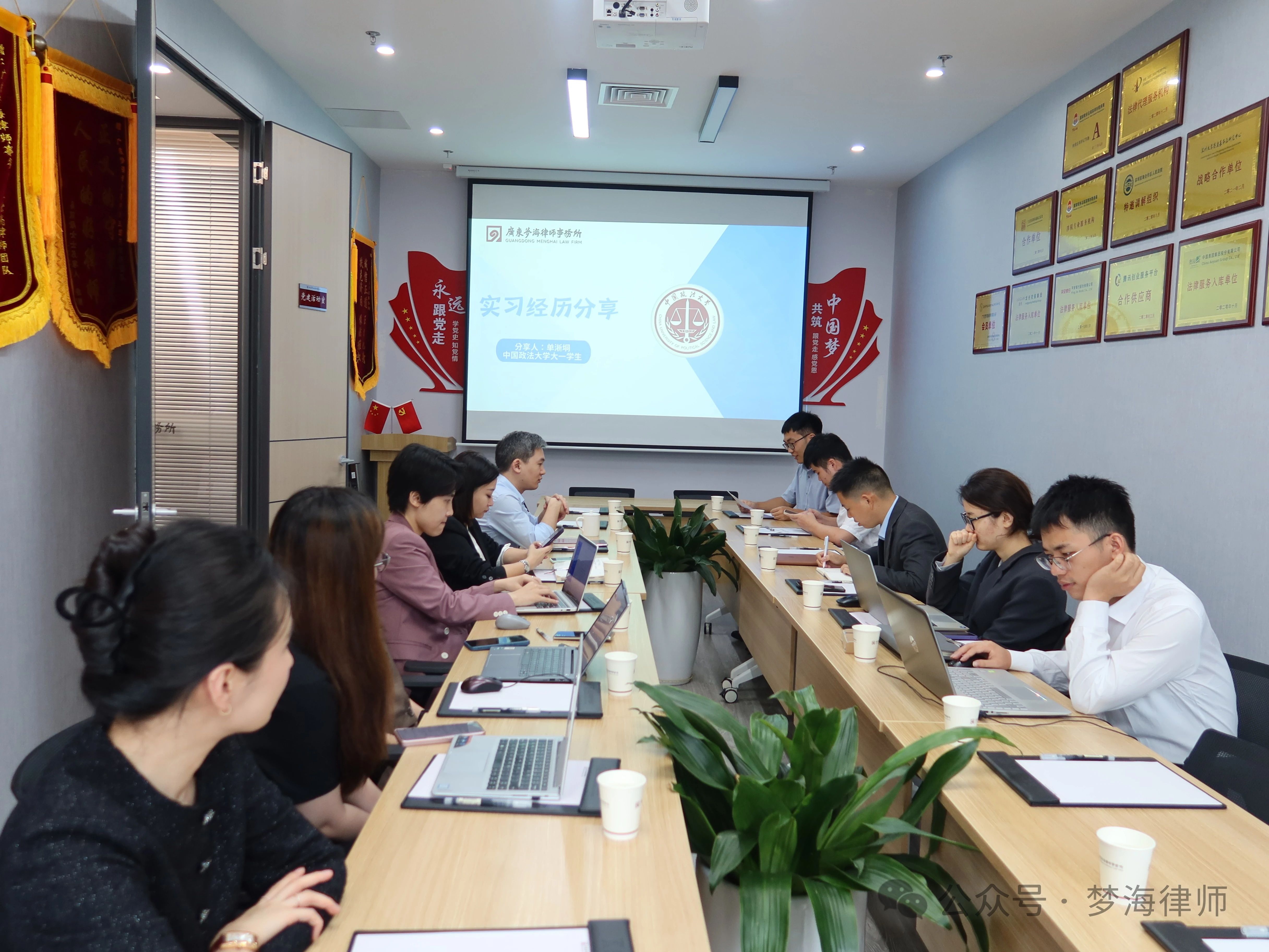 梦海律所不仅仅是一家律所,更是基于国内外一流法学院与法律领域的专业培训平台。梦海律所的律师团队基本上毕业于国内外知名院校,拥有法律服务领域丰富的专业经验。“与凤凰同飞,必是俊鸟;与虎狼同行,必是猛兽”。在一个月的实习期间,两位实习生与执业律师、资深律师共事,在日常工作中不断地向他们学习法律人所独有的专业、严谨、高效的精神。此外,在实习期间两位实习生还参加了多个专题分享会,如杨廷龙律师“债权人撤销之诉与强制执行程序的衔接及实现路径”专题分享会、叶伟锋律师“漫谈普通法——原则、传统与衡平法”专题分享会。在与这些优秀的法律人的相处过程中,两位实习生都得到了潜移默化、受益匪浅的全方位提升。