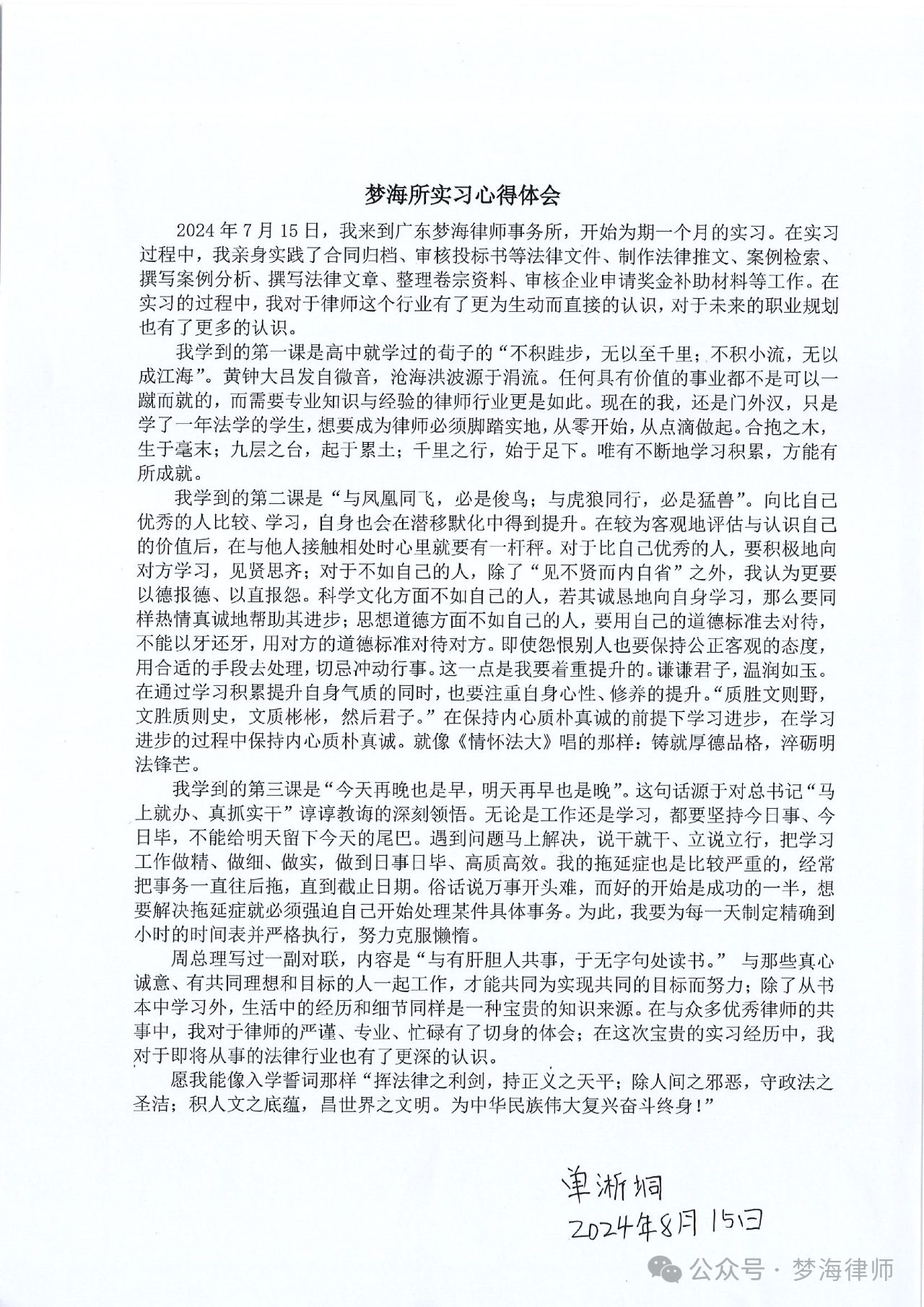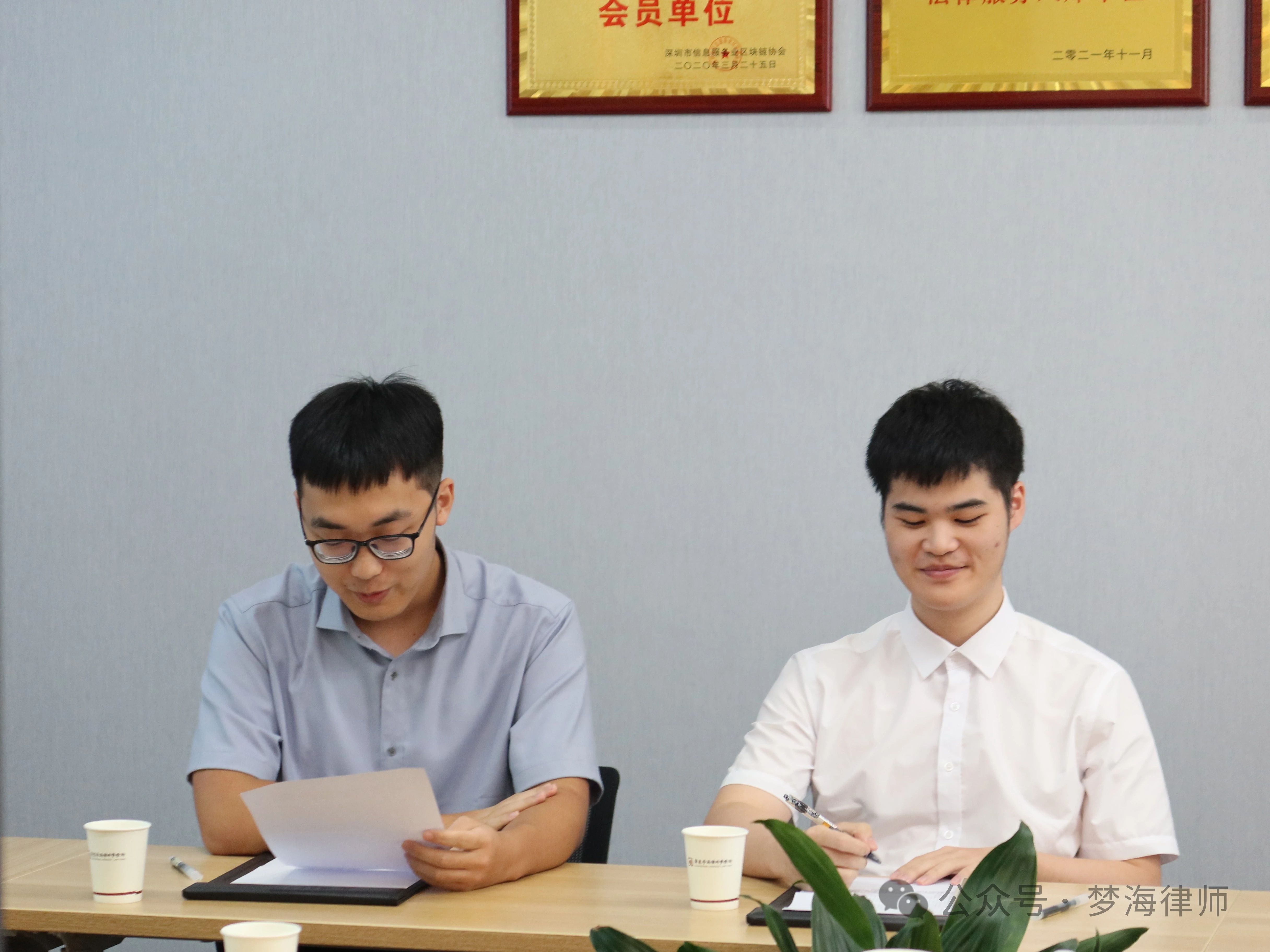 广东梦海律师事务所自2018年7月成立以来,一直注重吸纳与培养高素质法律人才。早在2021年,梦海所便与深圳大学法学院达成战略合作,双方签订校外实习基地建设协议。而在2024年的今朝,梦海所秉持着“源于前海、立足湾区、面向世界”的理念,已成为目前在前海实际经营规模最大的律师事务所之一,吸引着全国各地知名法学院校的优秀学生前来实习。在2024年暑期,两位实习生——来自中国政法大学的单淅垌和来自西南政法大学的吴子健,跨越数千公里,来到广东、来到深圳、来到前海、来到梦海所。他们满怀对于公平正义的追求以及对于律师行业的憧憬,在梦海所度过了受益良多、无比充实的一个月。