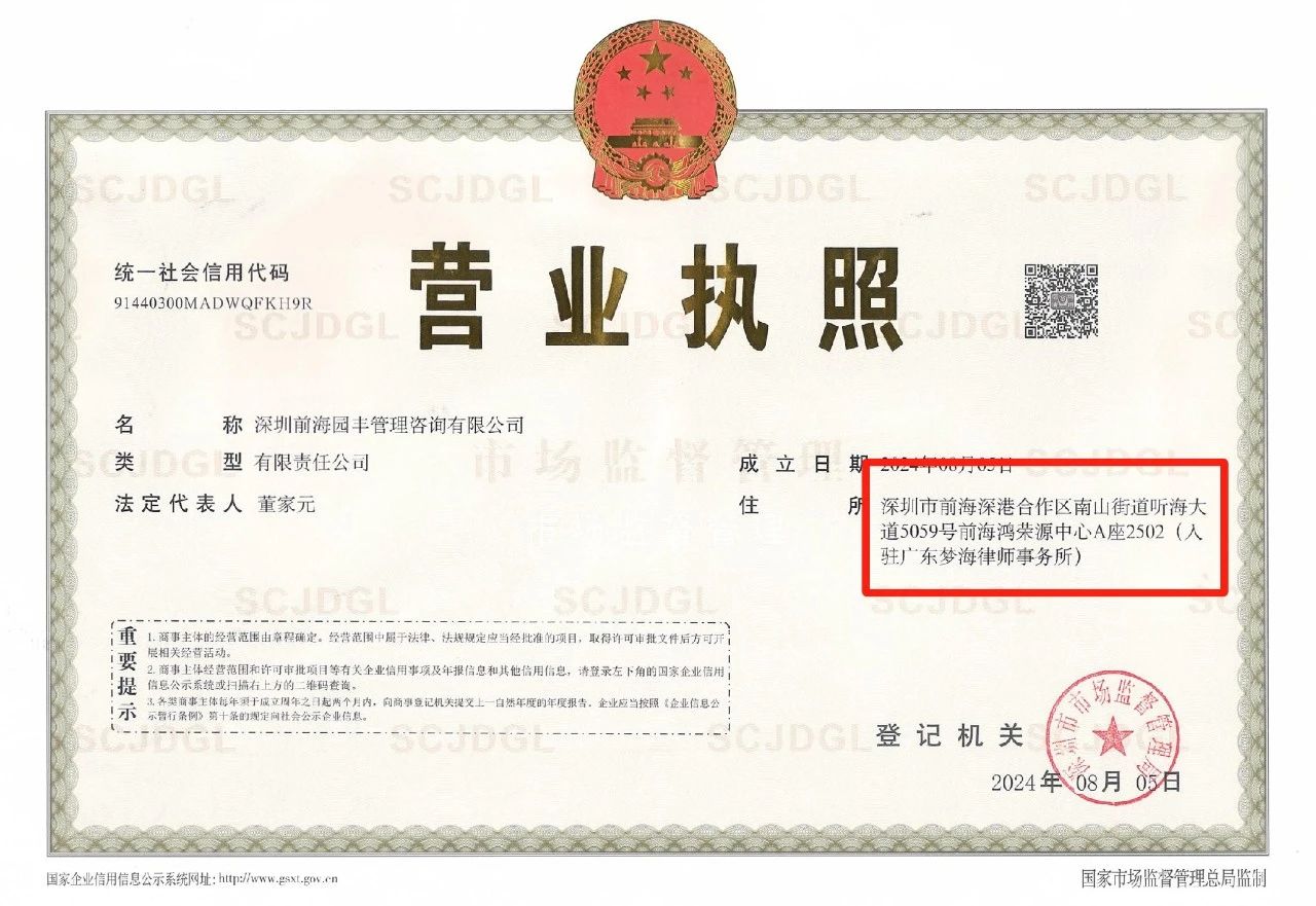梦海动态 | 广东梦海律师事务所第一家地址托管企业营业执照获得深圳市市场监督管理局批准