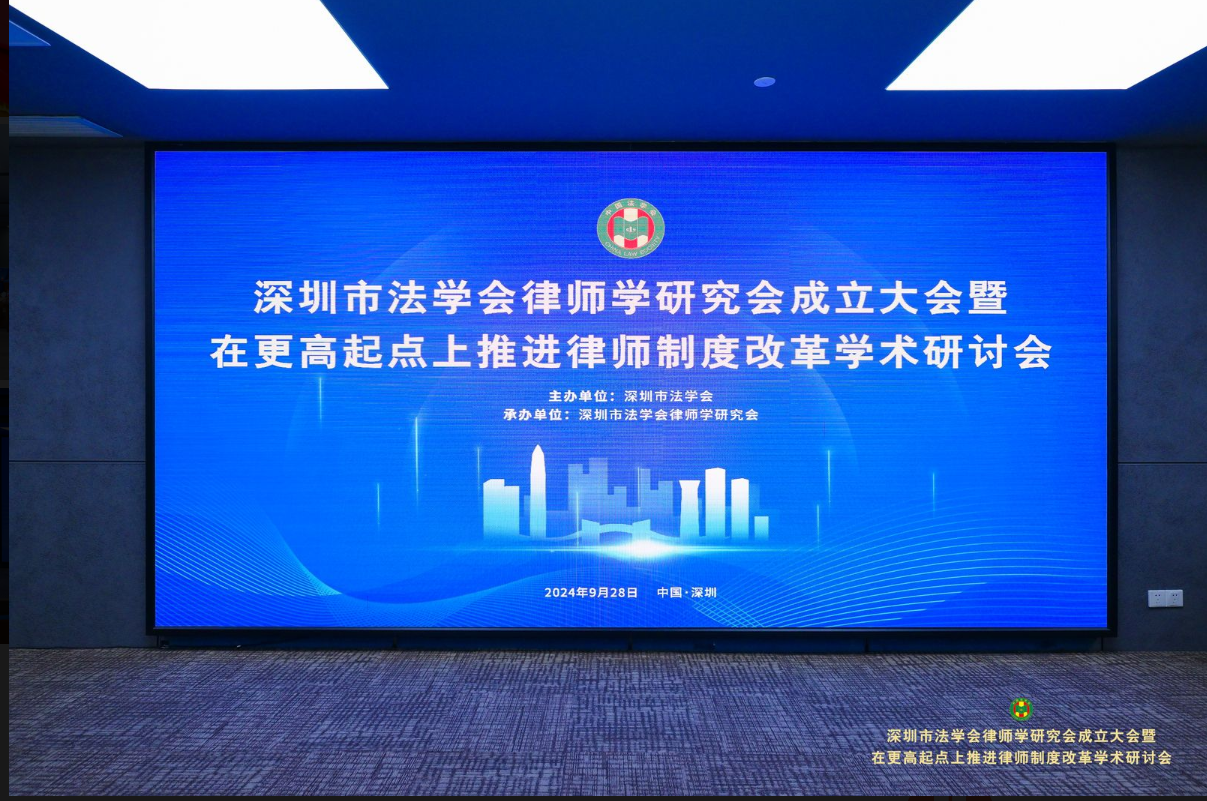 2024年9月28日,深圳市法学会律师学研究会成立大会暨“在更高起点上推进律师制度改革”学术研讨会成功召开,中国法学会律师法学研究会副会长,中国政法大学法学院教授、律师学研究中心主任王进喜,广东省法学会副会长,省十三届人大常委、教科文卫委主任委员,省委原常务副秘书长于敏,深圳市委政法委常务副书记,市法学会党组书记、常务副会长胡庚祥,深圳市司法局党委委员、副局长曹海雷等领导和专家学者出席会议并致辞。