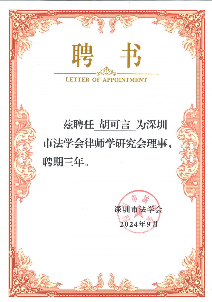 大会表决通过《深圳市法学会律师学研究会章程》,选举出第一届理事会的会长、常务副会长、秘书长、副秘书长及理事。广东梦海律所胡可言律师受邀参与本次律师学研讨会,并获选聘为律师学研究会第一届理事会理事,这充分彰显出相关部门和领导对梦海律师在律师学以及律师行业相关理论研究、法治实践等层面水平的认可。