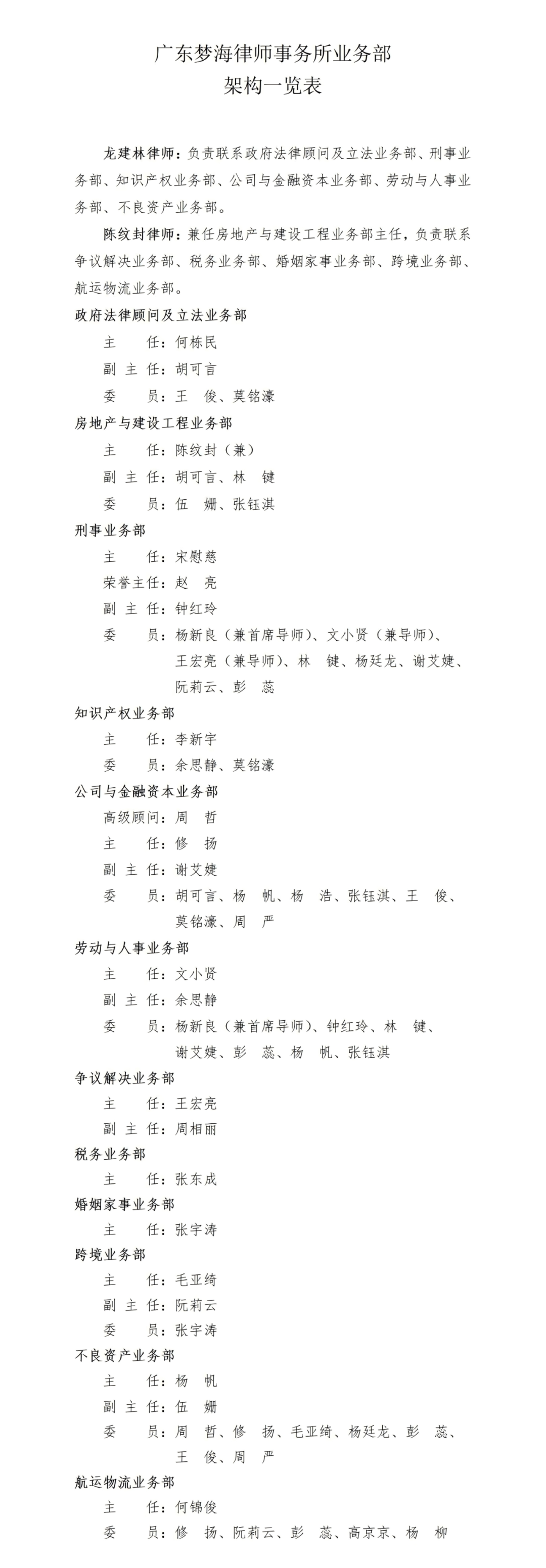 广东梦海律师事务所业务部架构一览表