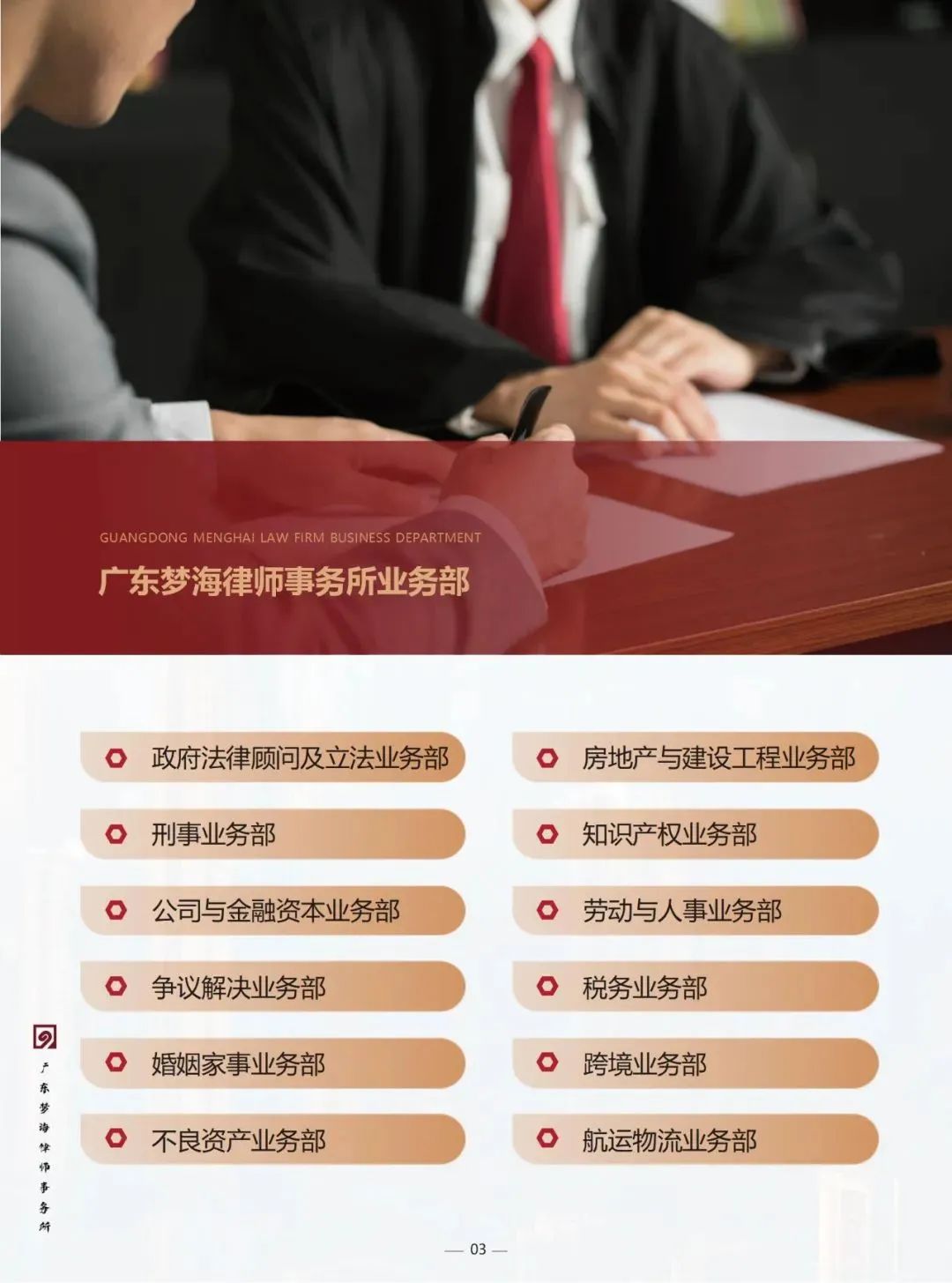 广东梦海律师事务所业务部自2023年底初创,后于2024年11月份、2025年1月份先后经过两轮优化调整,现已组建起涵盖12个专业领域、精品化突出的专业法律服务体系。
