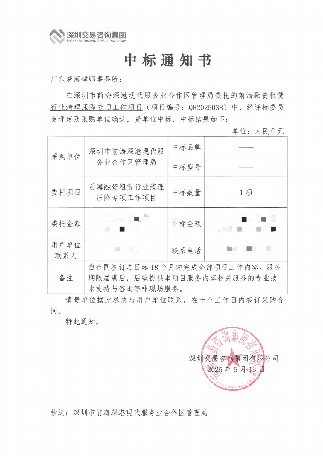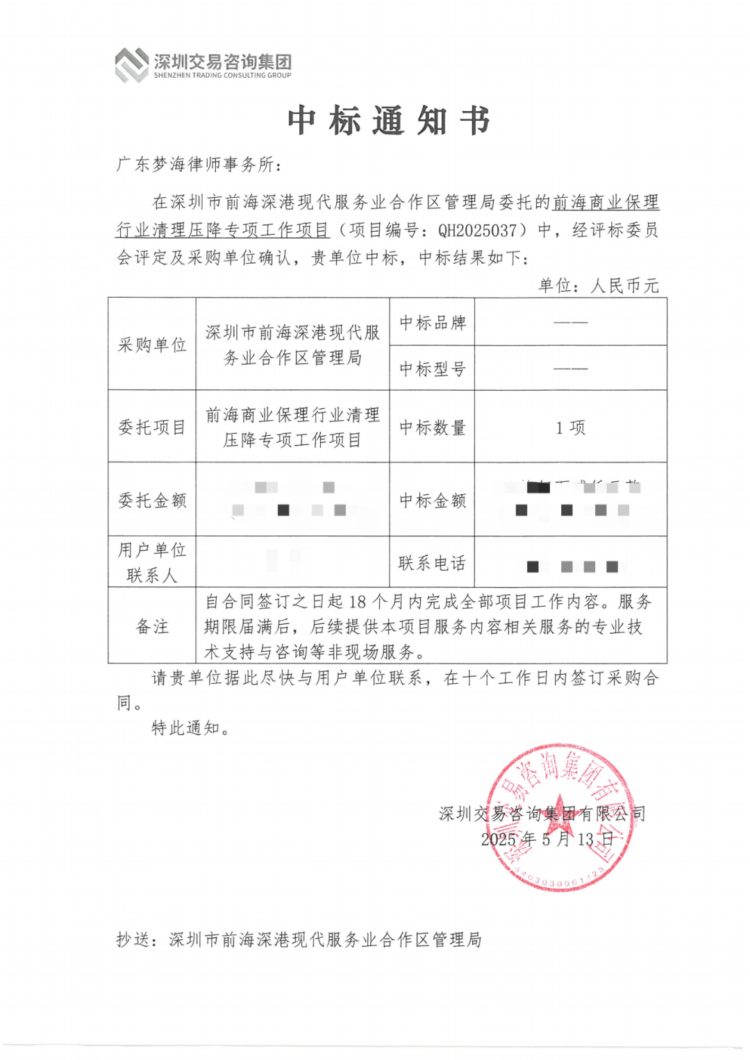 2025年5月13日,广东梦海律师事务所收到深圳市前海深港现代服务业合作区管理局“前海商业保理行业清理压降专项工作项目”和“前海融资租赁行业清理压降专项工作项目”的中标通知书。