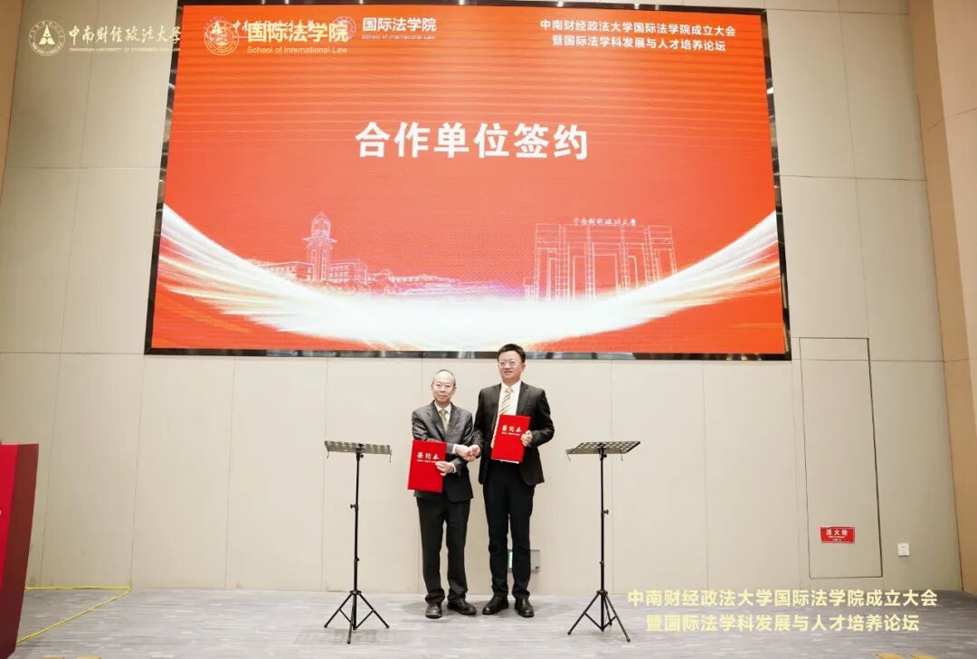 2025年10月25日,中南财经政法大学国际法学院成立大会暨国际法学科发展与人才培养论坛在法学科研大楼一楼大报告厅举行。中南财经政法大学校党委书记侯振发,校长助理赵凯,外交部原翻译室主任、美大司副司长、中华人民共和国驻新西兰、库克群岛、瑞典大使陈明明等领导以及司法实务与国际组织代表、老教师代表、校友代表、国际法学院领导班子及全体师生参会。在会议中,中南财经政法大学国际法学院与广东梦海律师事务所正式签署合作协议,广东梦海律师事务所党支部书记、中南财经政法大学92级校友张光超作为梦海律所代表与中南财经政法大学国际法学院徐伟功院长进行签约。