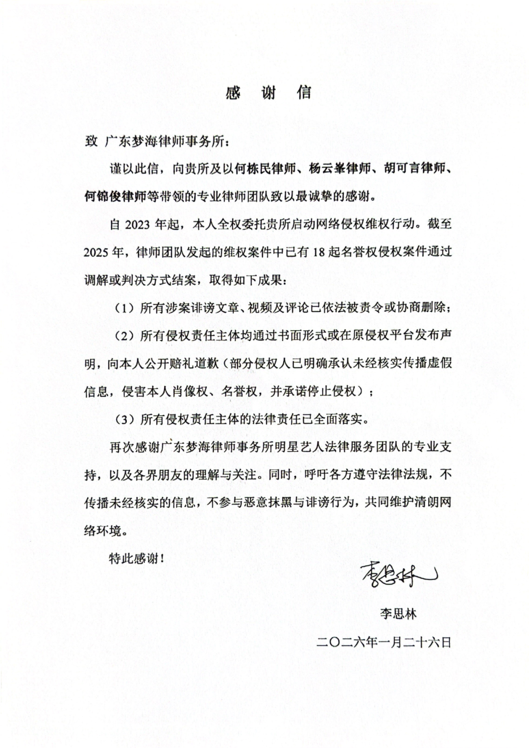 广东梦海律师事务所明星艺人法律服务团队收到Nancy李思林女士《感谢信》